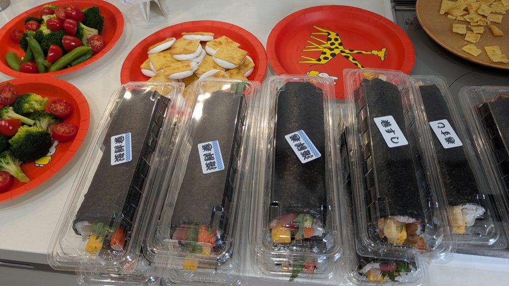 豆まきで一汗かいた後は、みんなでお待ちかねの食事タイム。 用意しておいた恵方巻を、今年の恵方である「南南東」を向いて静かに頬張ります。お隣のお父さんの名演技の余韻もあり、終始笑顔の絶えない賑やかな週末となりました。
