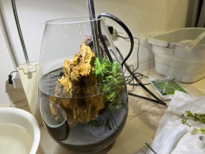 レイアウトは子どもが決めてポンプの設置、ソイルの充填、石や水草のレイアウトを手伝いながらなんとか完成しました。私の方がメインでしていたような~。