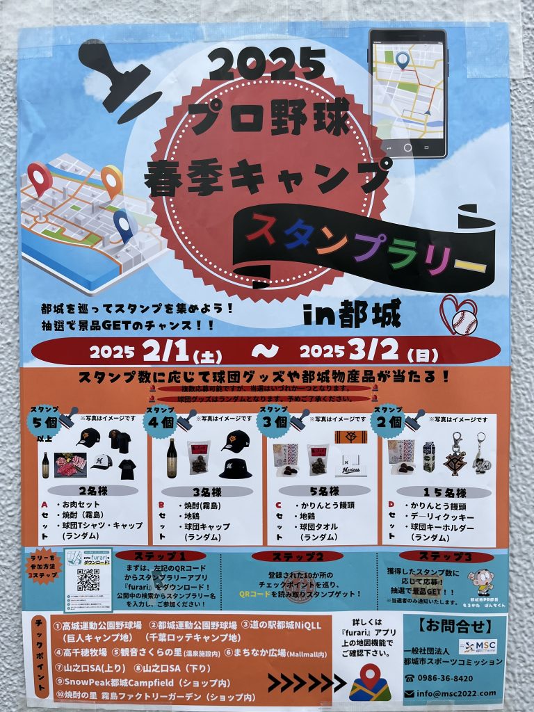 また球場周辺にはご当地グルメの屋台や、球場と観光地を巡ると抽選で球団グッズなどがもらえるスタンプラリーなど練習見学以外にも楽しみが沢山ありますので、皆さんも是非球場に足を運んでプロの技と宮崎の味を堪能してみては如何でしょうか。