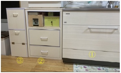 ①:流し台 ②:引き出し付き収納ボックス