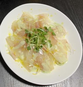 そこで今回は、いつものように醤油をつけて食べるだけではなく、ちょっとお洒落にカルパッチョに挑戦してみました!ソースは市販のものを使いました(笑)。魚は真鯛を選び、ハーブ系(バジル・イタリアンパセリ)のソースをかけて仕上げにレモンの皮をアクセントとして散りばめて完成です。