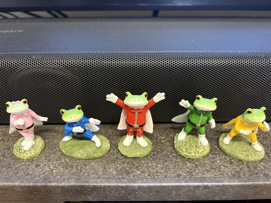 まずは「カエルのゴレンジャー」。 これは先日、夫の誕生日に子どもたちがプレゼントしてくれたもの。「そんなに喜ぶ?」と驚くほど大喜びで、実は心の底から欲しかったアイテムだったようです(笑)。以来、リビングの特等席に飾り、眺めては癒されている毎日です。