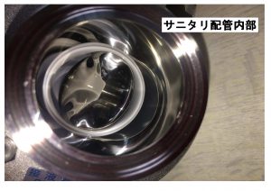 この“サニタリー”と聞いて、まず“食品用”とみなさん認識はあると思いますが、実際はどのような特長があるかわかりますか?何か難しい規格があるのでは?と感じてしまいますが、なにより1番は“掃除がしやすい”(菌を発生させない)という事です。食品などデリケートなものが接するので表面は汚れが付きにくいように研磨処理がされています。写真でもわかるように内部は鏡の様にピカピカと輝いています。ここを液体が通過します。さらには“分解清掃”と聞くとなかなか難しい技術や工具が必要になるのでは?と考えますがそこも違います。誰でも簡単に“分解清掃”が出来るような継手“へルール継手”というものがあります。サニタリーポンプと配管やバルブを接続するのですが、工具を使用せずに分解組立できる様にこの継手を使用します。へルールとへルールの間にガスケットを入れてクランプバンドで締めこんで組立します。このへルール継手付きの配管は継手と配管を溶接して個別に作りますがこれは丁寧な技術が必要です。
