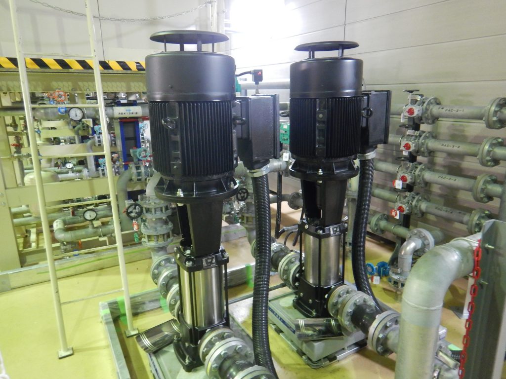 こちらの施設では、発電所の上部にある貯水池の水を冷却水として使用している為、循環配管内の圧力が高圧力でも対応できる立型多段渦巻きポンプを使用しています。