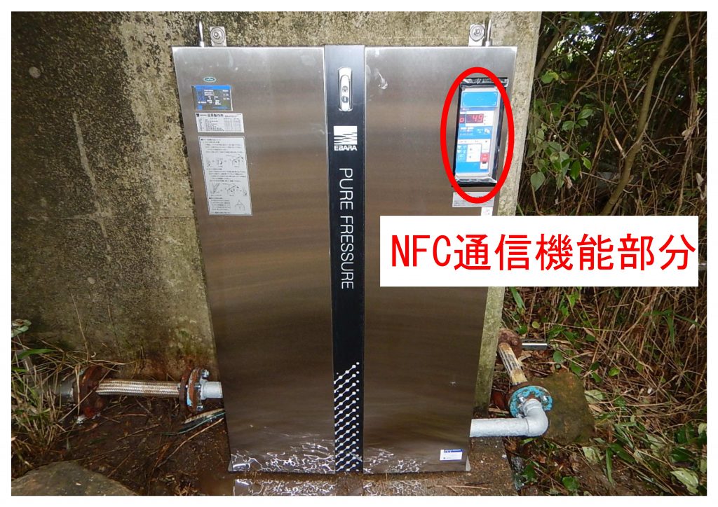 本製品は縦型の多段ポンプが内蔵されているため、高揚程に優れ、メンテナンスが容易にできます。さらに、NFC通信機能搭載で、運転情報を瞬時に取得することができます。NFCとは、近距離無線通信技術のことで、Wi-FiやBluetoothのような無線通信方式により、スマートフォンをかざすだけで、給水ユニットの運転状態を確認することができ、設備の管理や点検作業の効率化を図ることを目的としています。