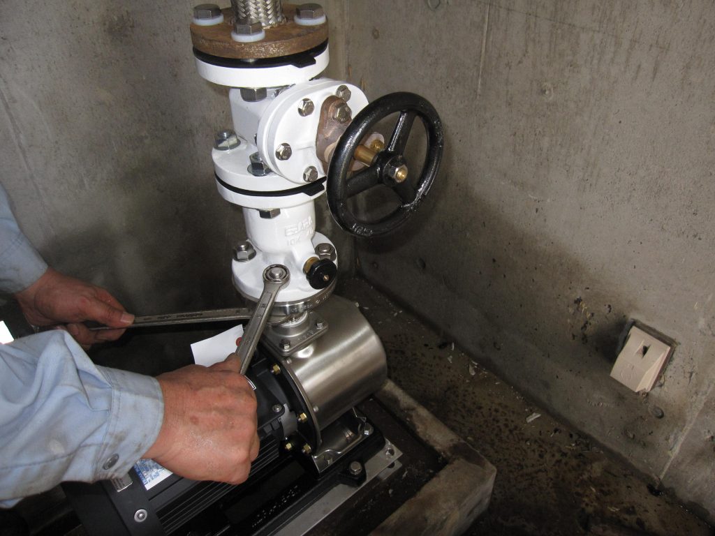 今回の更新対象のポンプは、地上の受水槽から屋上の高架水槽まで揚水する目的で使用しております。住民の方々が外出され使用頻度の少ない昼間に作業を行いました。