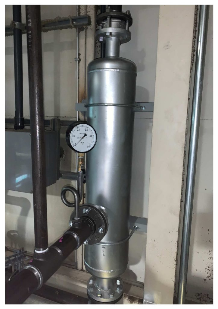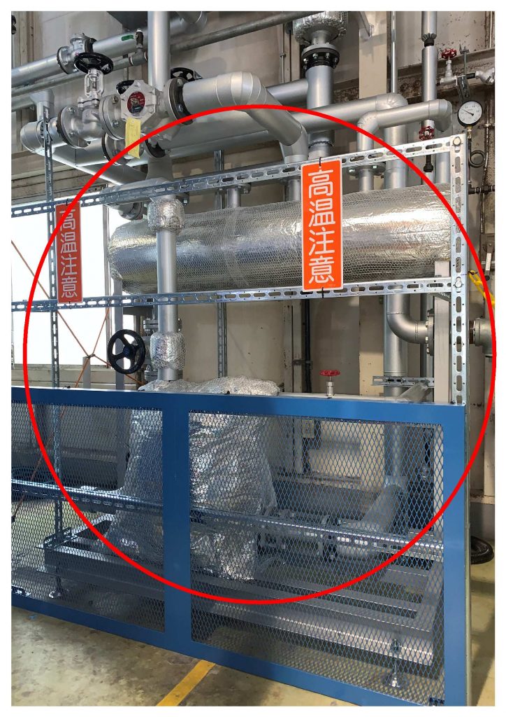 システムとしては、スチームトラップで排出された高圧ドレンをフラッシュタンクで受け、再蒸発させた蒸気を低圧の系統へ接続して使用します。(写真②)