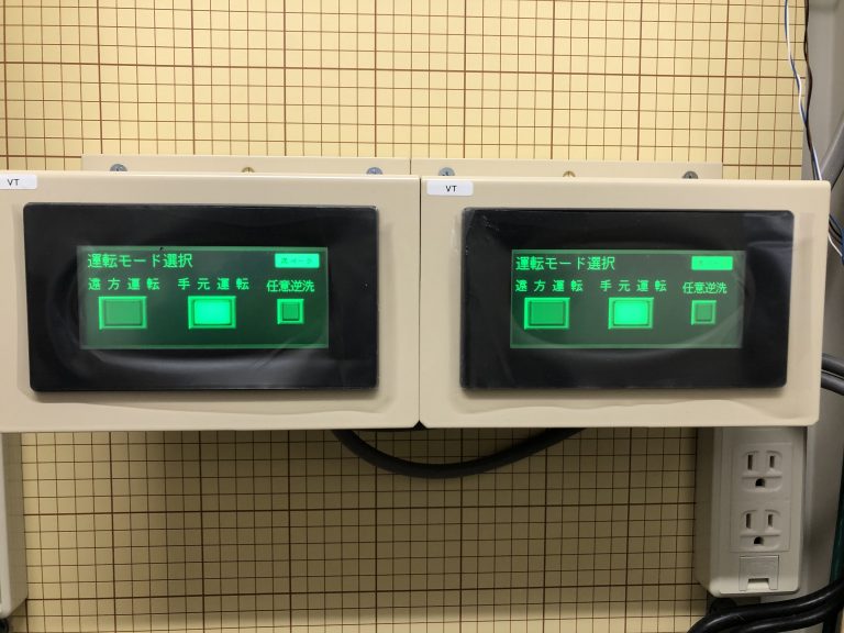 今回紹介写真は、ろ過システム全体写真は記載しておりませんが、制御関係の紹介を行います。決められた時間に起動、停止、殺菌装置起動を制御盤側でも設定可能ですが、ホテル事務所側でもリモコン操作で時間変更及び異常監視できるリモコン(タッチパネル)を取り付けております。