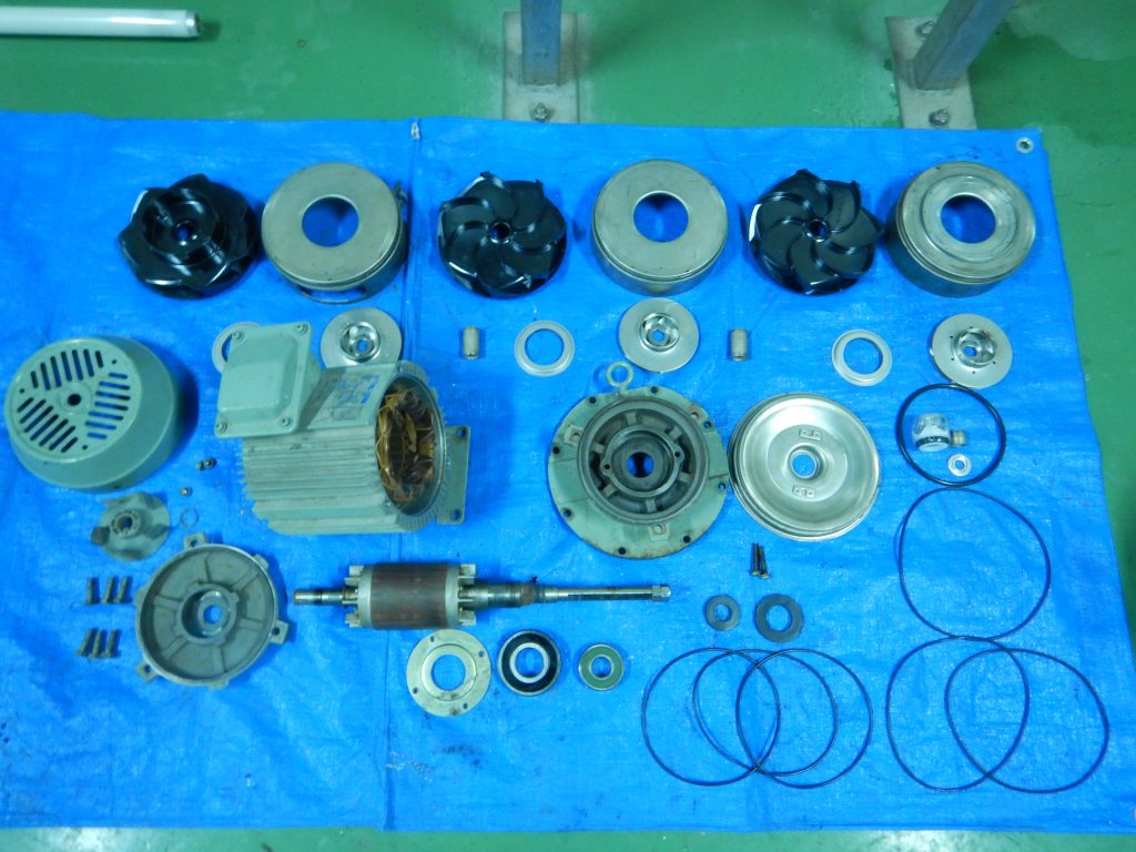 流体、流体温度、使用年数によりインペラ、ガイドベーン(案内坂)が摩耗、破損して圧力低下、能力低下の症状が発生しますので定期的な部品取替が必要になります。