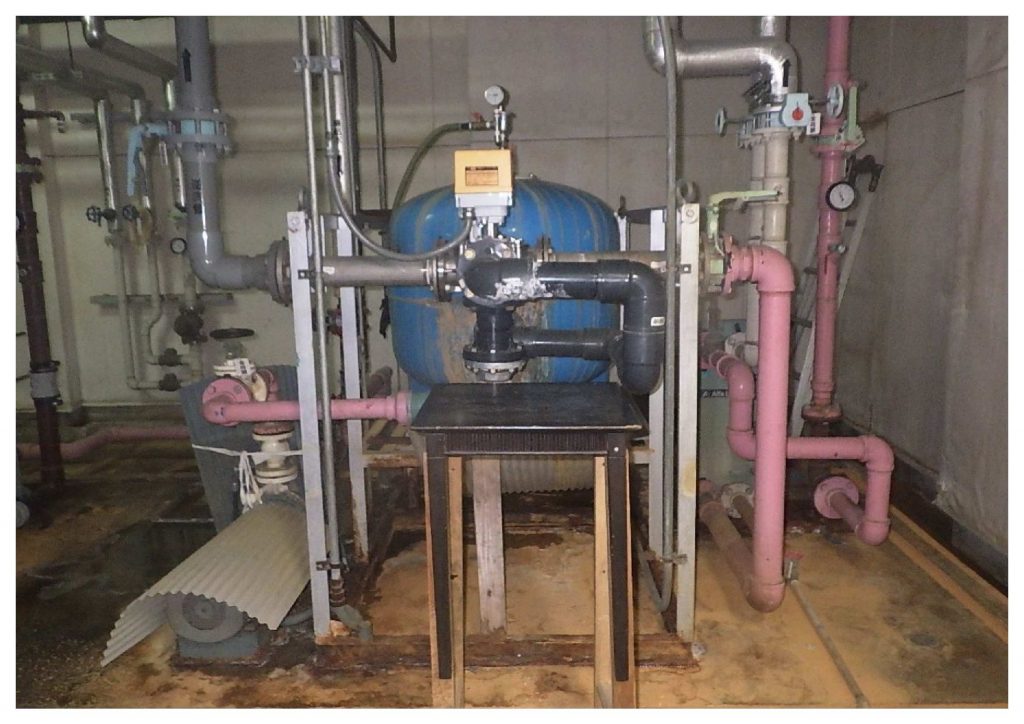 建物の構造上、付近に運搬車両が近づけなかったため、ほとんど手作業にて施工を実施しました。先ず、既設ろ過器のろ材を抜取り、既設配管・ろ過器の撤去をしました。