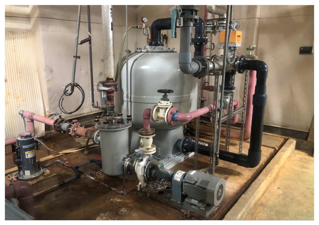 ろ過タンク本体を支えている鋼製架台が錆による劣化しており、不安定な状態でしたので、基礎に敷板を敷いたうえでろ過タンク本体を設置しました。これにより機器の振動を抑え安定するので、お客様も安心して使用できると考えます。