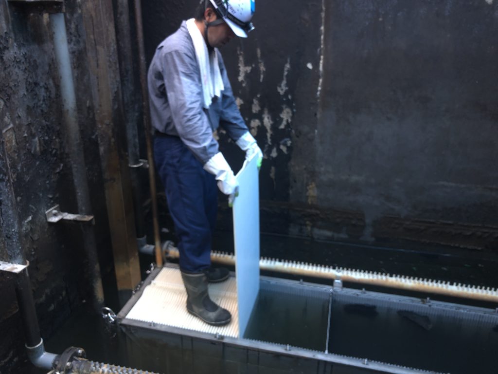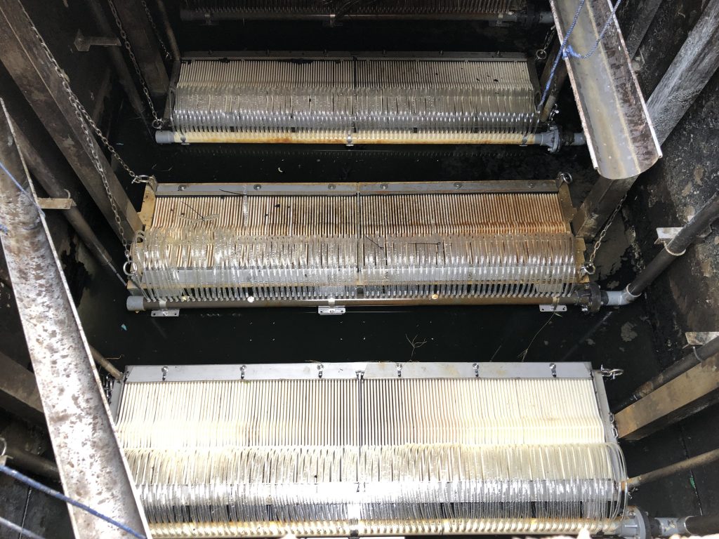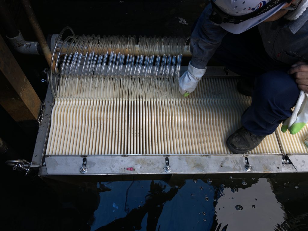 今回は液中膜300枚の取替でしたが、液中膜取替後の水質検査でSS(浮遊物質・懸濁物質)の数値が1mg/L未満(基準値200mg/L以下)と問題なく、安全に廃水処理することができております。