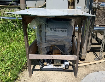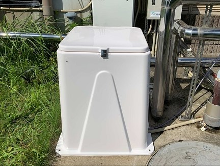 今回の現場では循環型浴槽で使用している塩素薬注装置の屋外カバーを設置しました。
