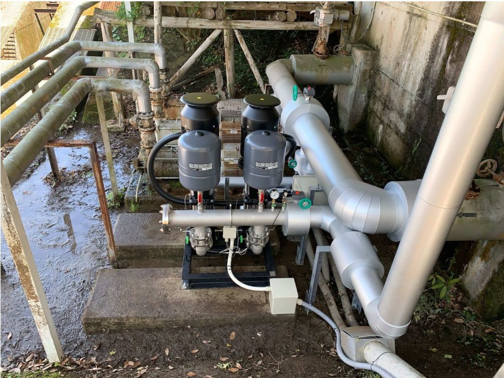 今回はポンプの吸込み側と吐出側の配管をほとんど事前に製作し、現場施工時間を圧縮するよう努めました。事前に製作を行いますので、寸法が間違えていたら工事が進まなくなるリスクがありますが、製作会社様のご協力を頂き、なんとか無事に工期内に完了させる事ができました。