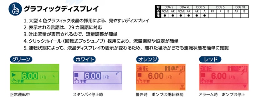機能としては29か国語に対応しており、運転状態に合わせて液晶画面の色を変え一目で運転状況が分かるので使いやすいものとなっています。その中でメンテンナンス時期になると液晶部がオレンジ色になり「まもなくサービス!ダイヤフラムと弁を交換!サービスキット97******」と表示してくれますので維持管理が容易です。更にポンプの型式・製番を画面に表示するので、万が一の故障時でもスムーズに問合せが出来ます。